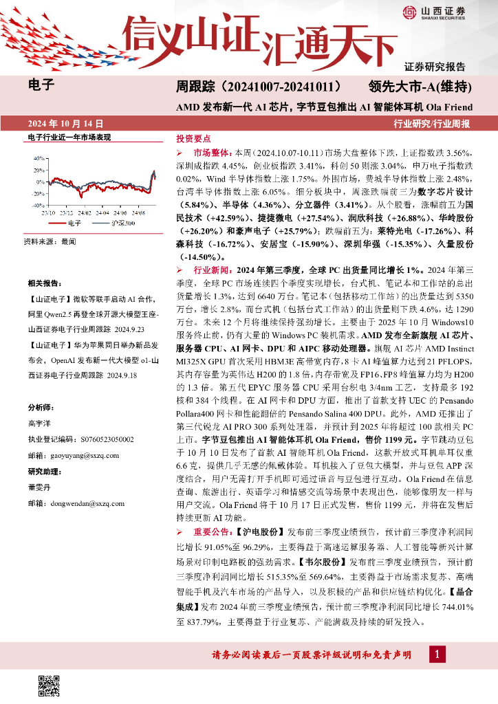 山西证券:电子周跟踪:AMD发布新一代AI芯片,字节豆包推出AI智能体耳机OlaFriend.pdf