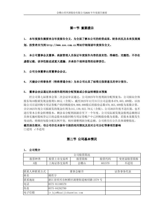 601579-会稽山:会稽山绍兴酒股份有限公司2025年年度报告摘要.pdf