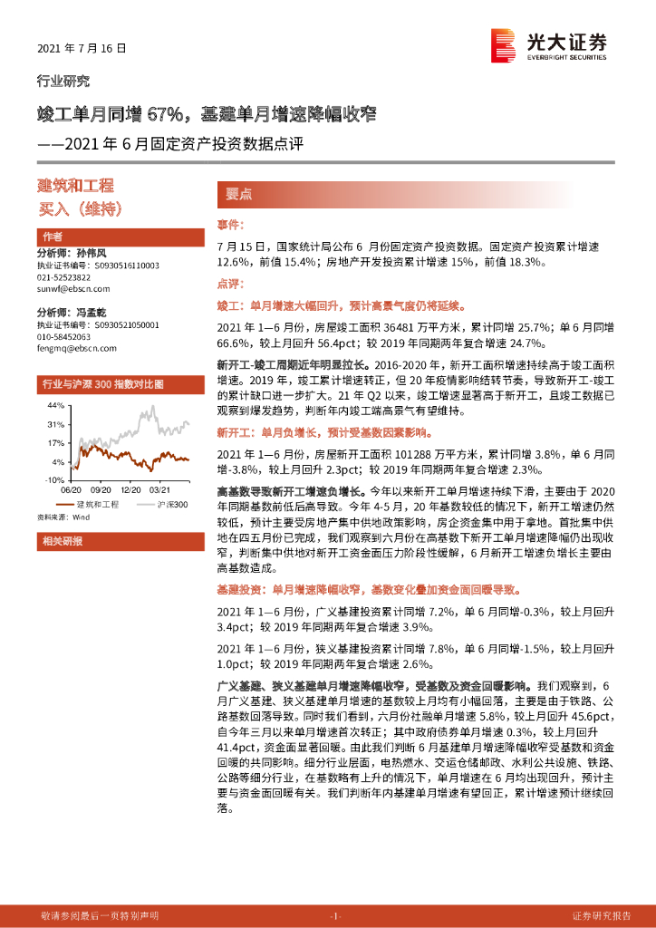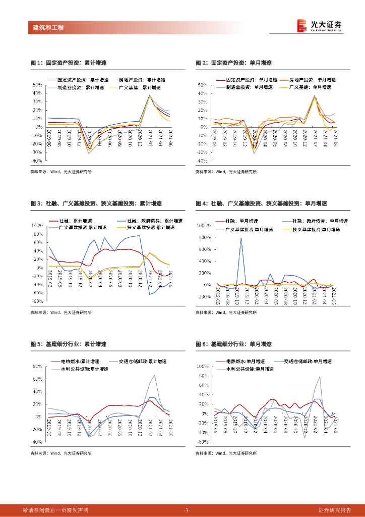 光大证券:建筑和工程2021年6月固定资产投资数据点评:竣工单月同增67%,基建单月增速降幅收窄.pdf