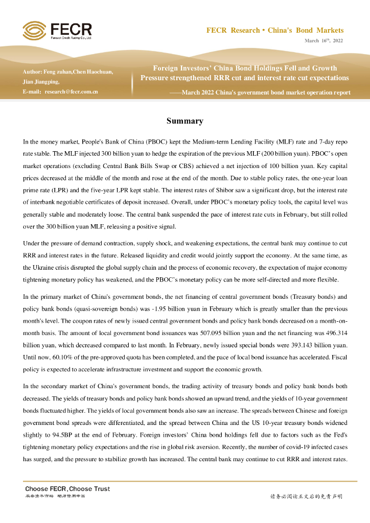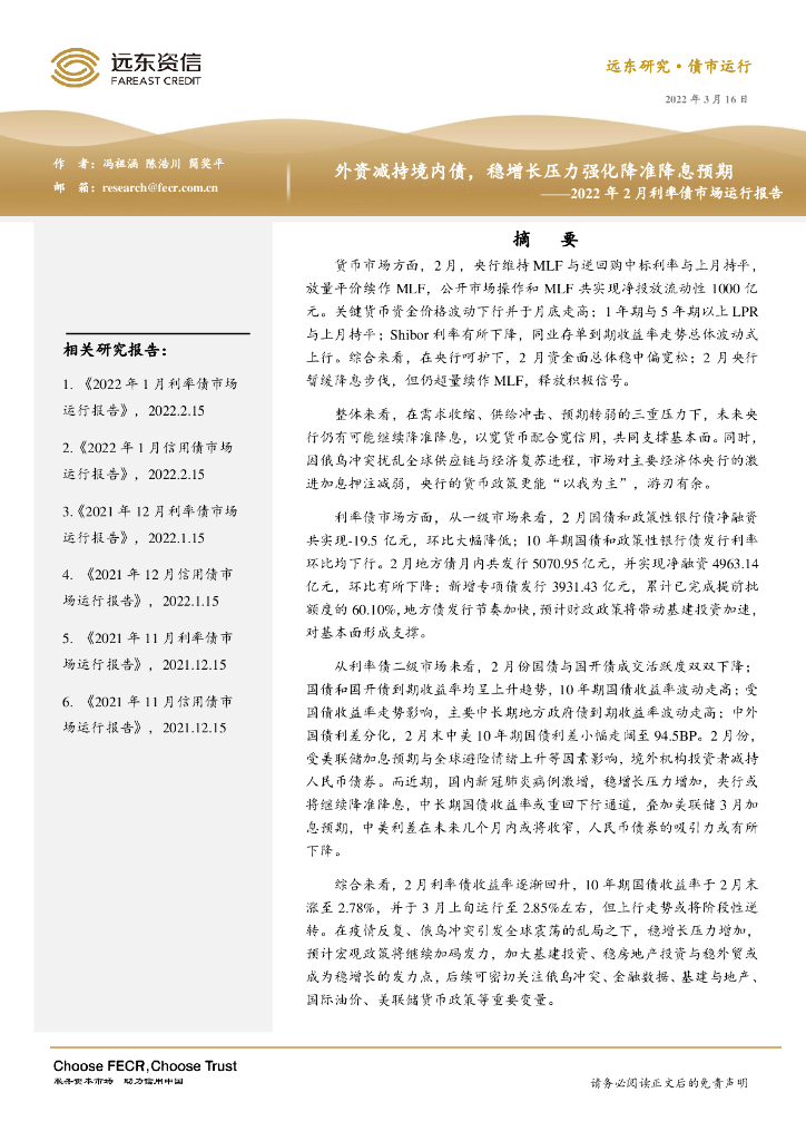 远东资信:外资减持境内债,稳增长压力强化降准降息预期——2022年2月利率债市场运行报告.pdf
