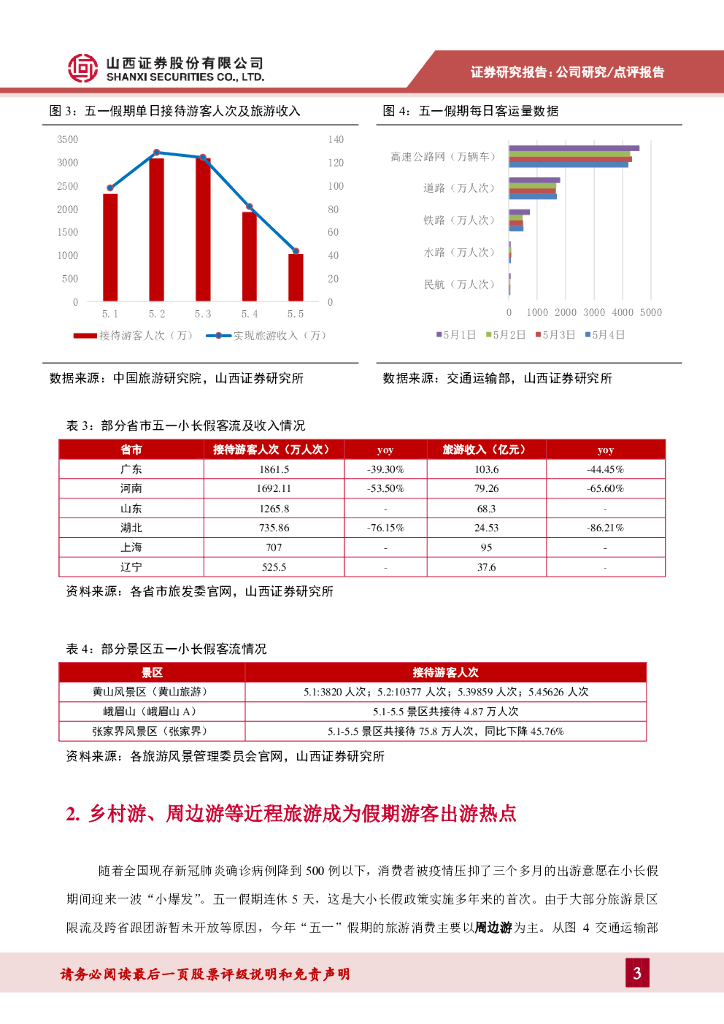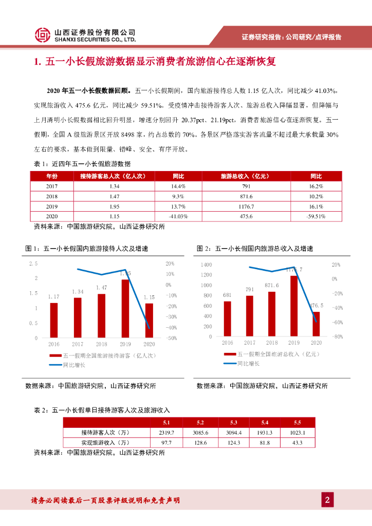 山西证券:2020年五一小长假旅游数据点评:旅游收入、接待游客人次同比下降显著,环比清明回升明显.pdf
