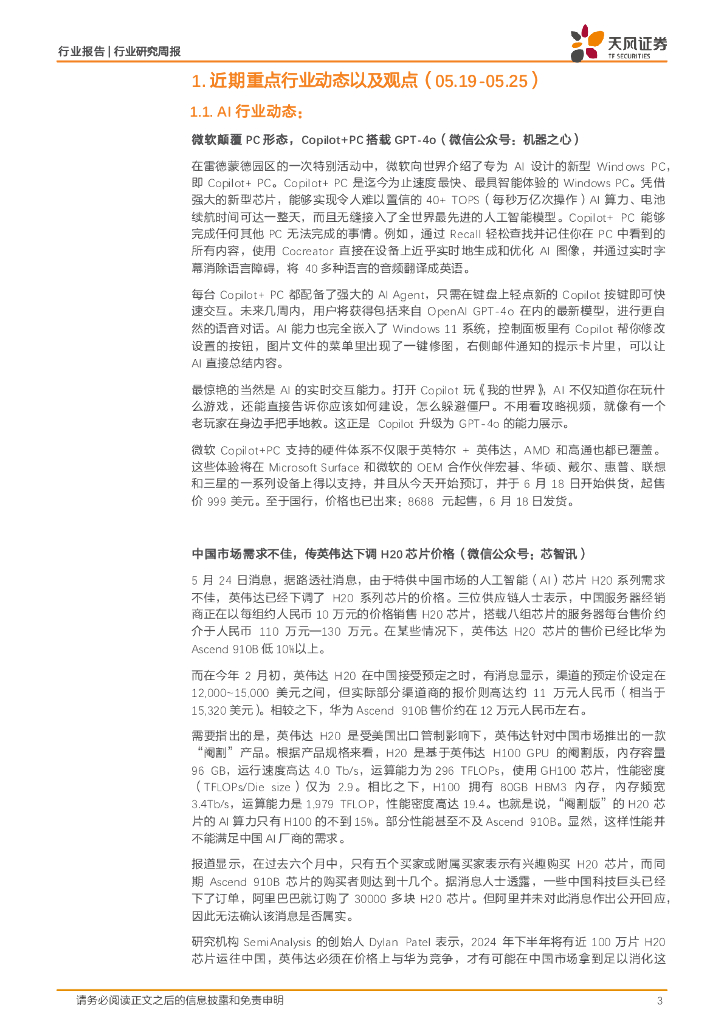 天风证券:通信行业研究周报:微软Copilot+PC搭载GPT-4o;传英伟达下调H20芯片价格.pdf