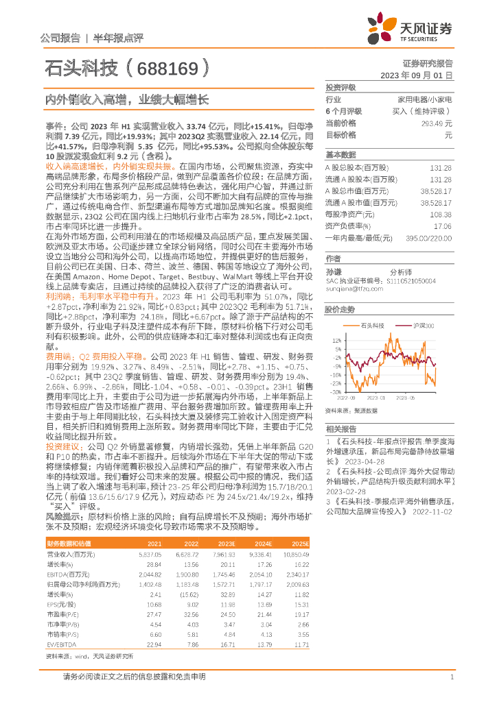 天风证券:石头科技(688169)-内外销收入高增,业绩大幅增长.pdf