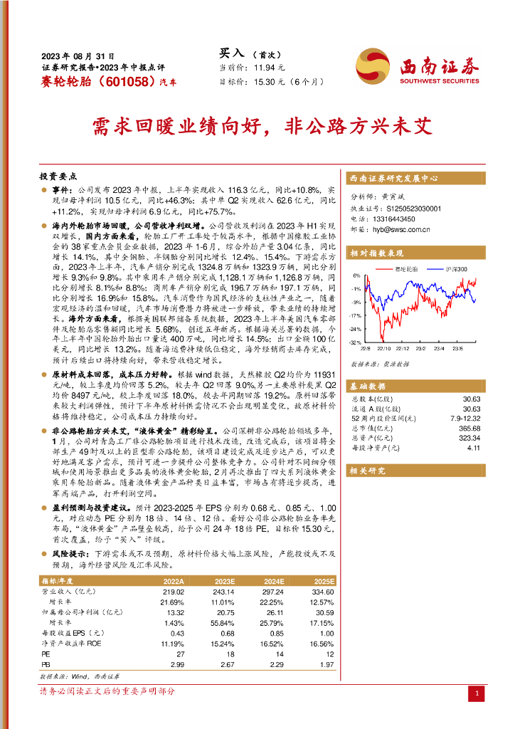 西南证券:赛轮轮胎(601058)-需求回暖业绩向好,非公路方兴未艾.pdf