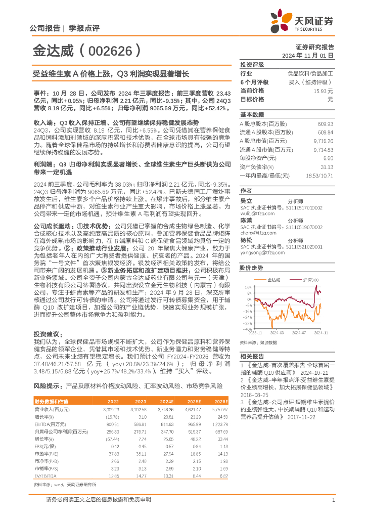 天风证券:金达威(002626)-受益维生素A价格上涨,Q3利润实现显著增长.pdf