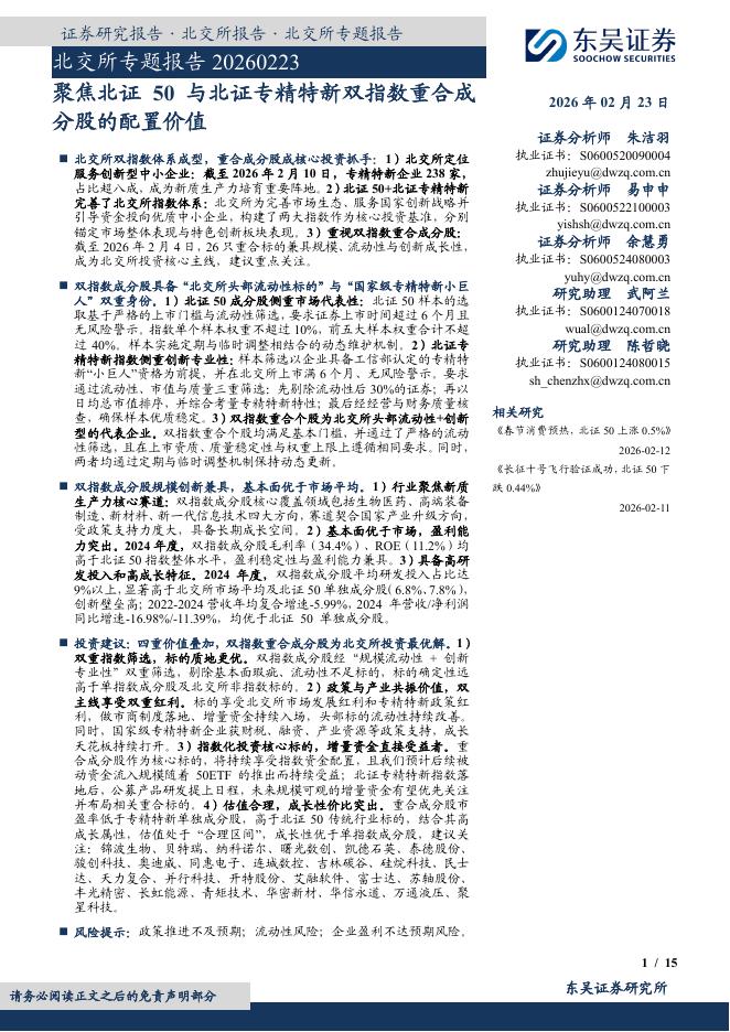 东吴证券:北交所专题报告:聚焦北证50与北证专精特新双指数重合成分股的配置价值-260224.pdf