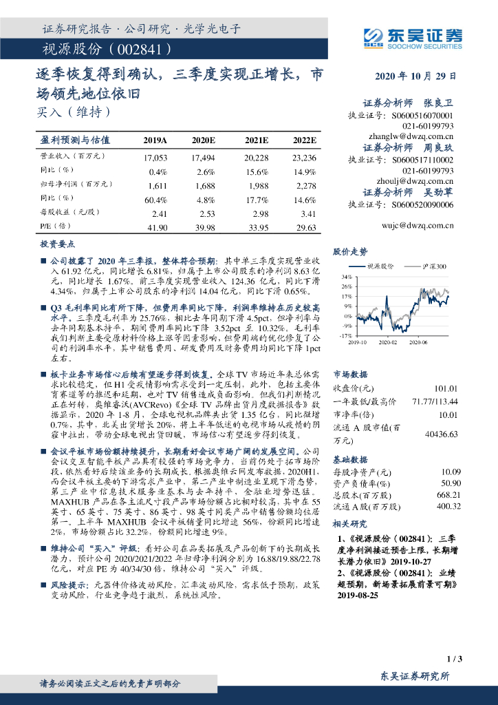东吴证券:视源股份(002841)-逐季恢复得到确认,三季度实现正增长,市场领先地位依旧.pdf