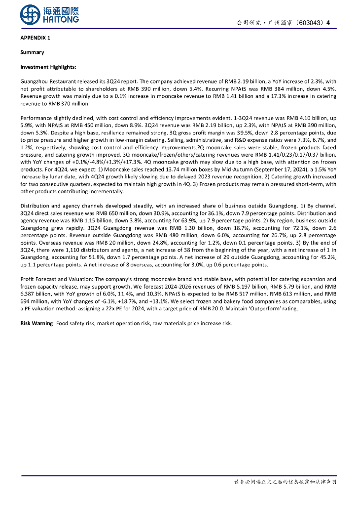 海通国际:广州酒家(603043)-公司季报点评:3Q24收入增2%净利降5%,月饼业务基本持平.pdf