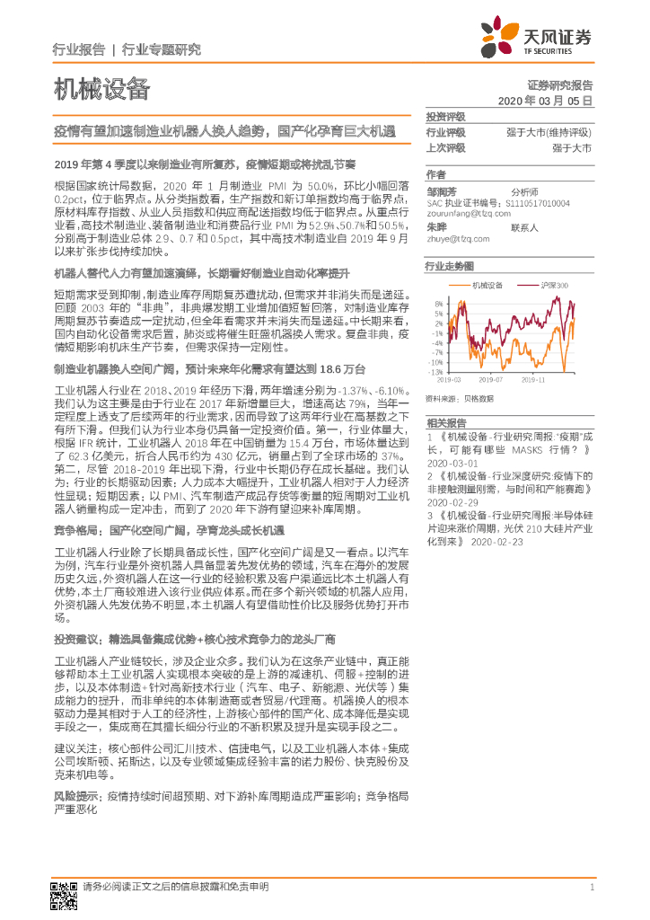 天风证券:机械设备行业专题研究:疫情有望加速制造业机器人换人趋势,国产化孕育巨大机遇.pdf