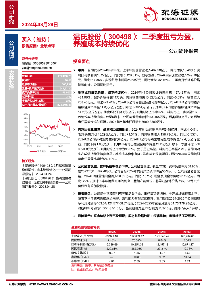 东海证券:温氏股份(300498)-公司简评报告:二季度扭亏为盈,养殖成本持续优化.pdf