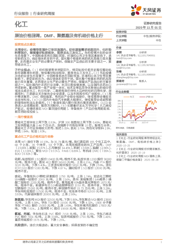 天风证券:化工行业研究周报:原油价格回调,DMF、聚氨酯及有机硅价格上行.pdf