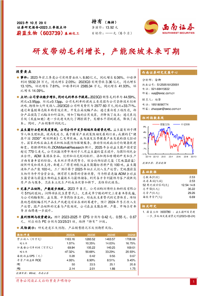 西南证券:蔚蓝生物(603739)-2023年三季报点评:研发带动毛利增长,产能爬坡未来可期.pdf
