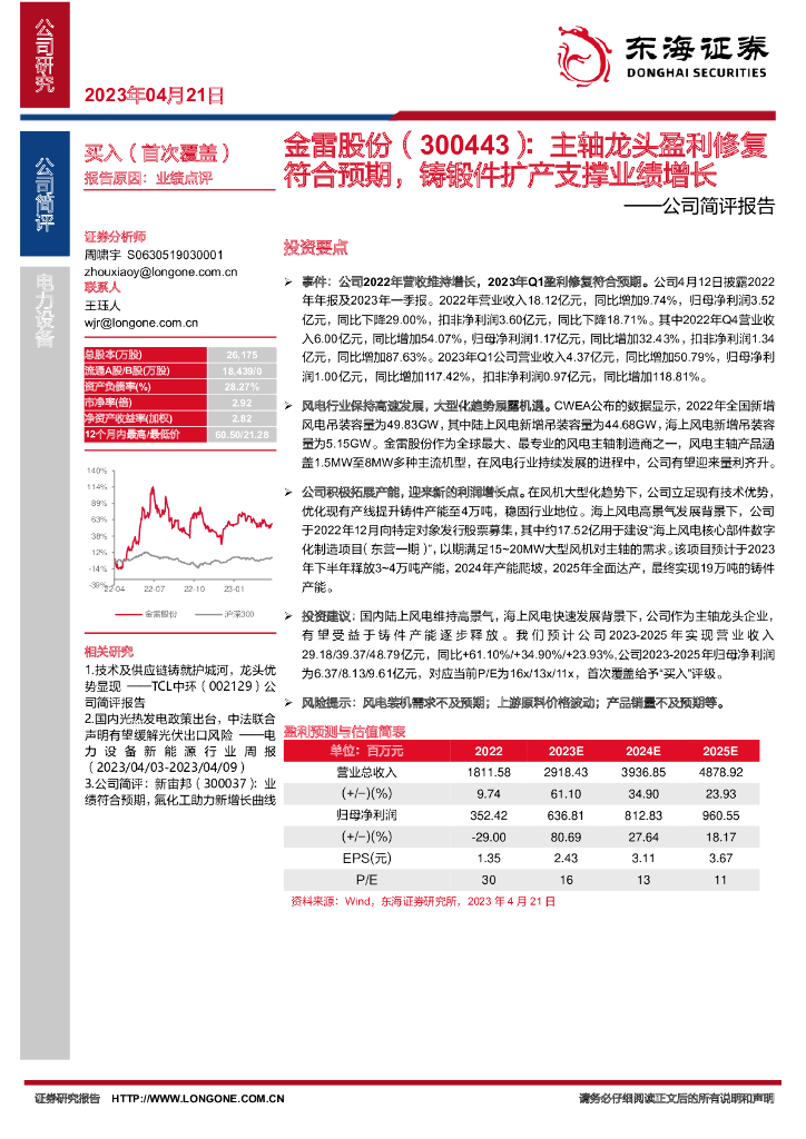 东海证券:金雷股份(300443)-公司简评报告:主轴龙头盈利修复符合预期,铸锻件扩产支撑业绩增长.pdf
