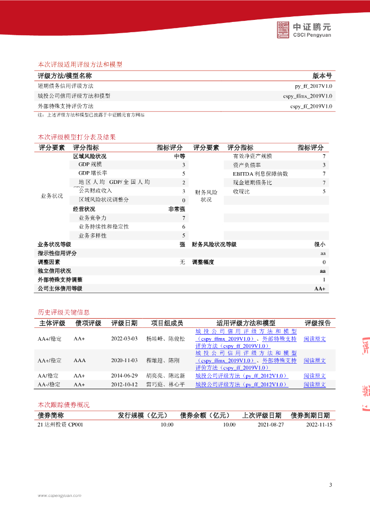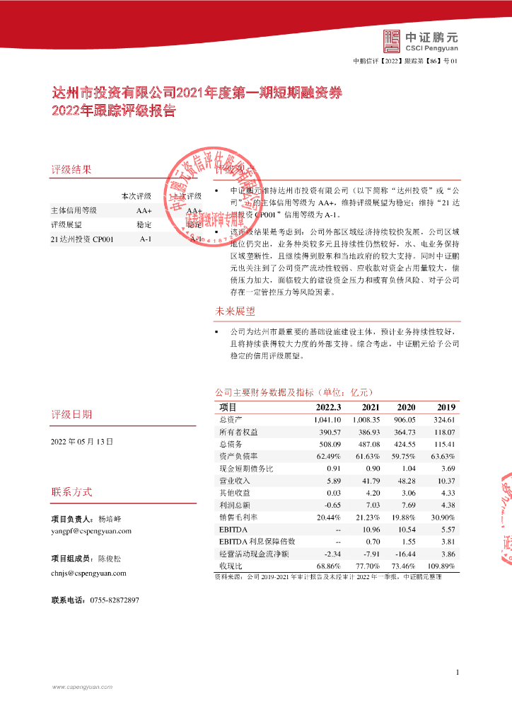 鹏元:达州市投资有限公司2021年度第一期短期融资券2022年跟踪评级报告.pdf