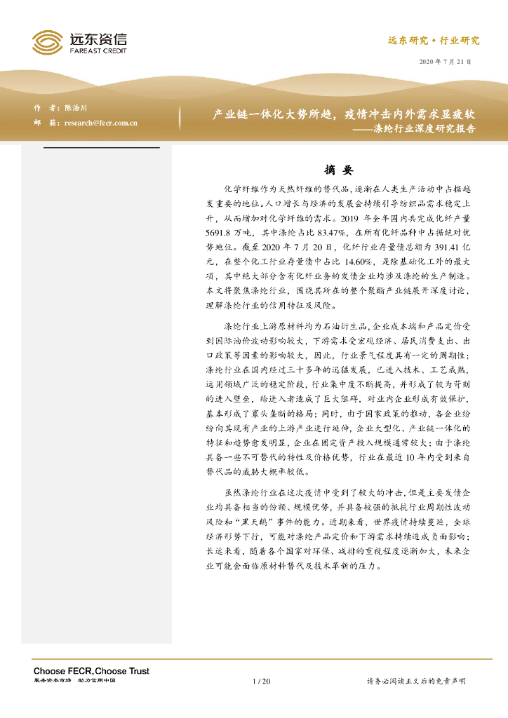 远东资信:产业链一体化大势所趋,疫情冲击内外需求显疲软——涤纶行业深度研究报告.pdf