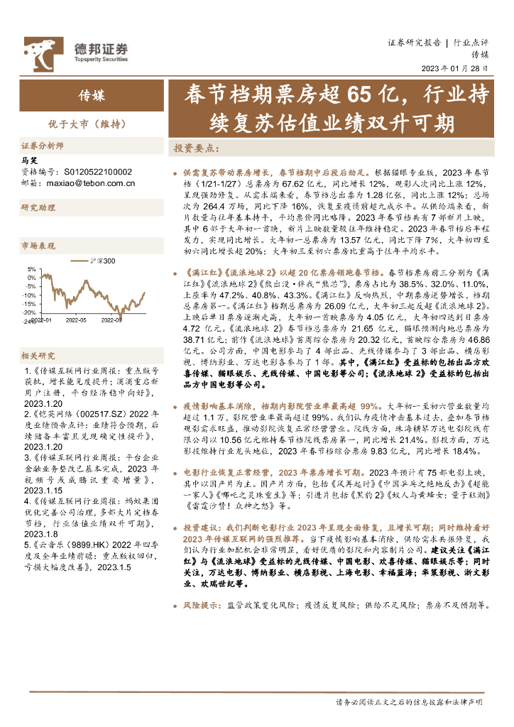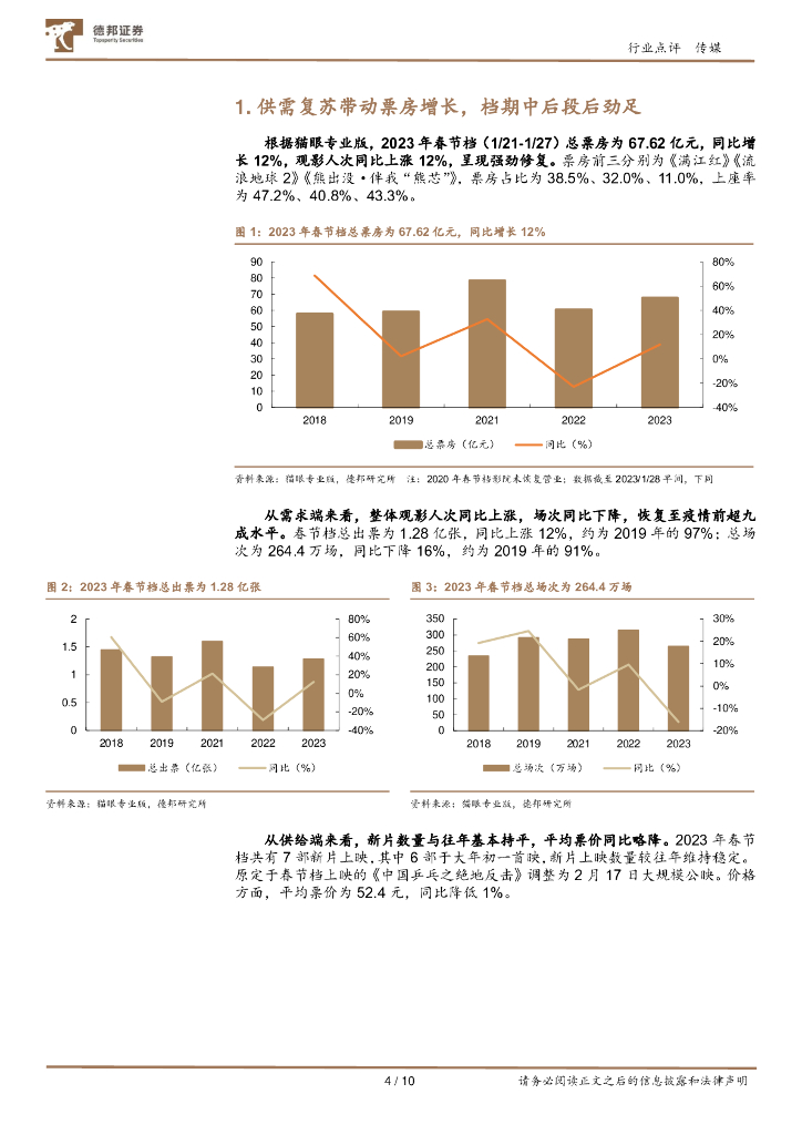 德邦证券:传媒行业点评:春节档期票房超65亿,行业持续复苏估值业绩双升可期.pdf