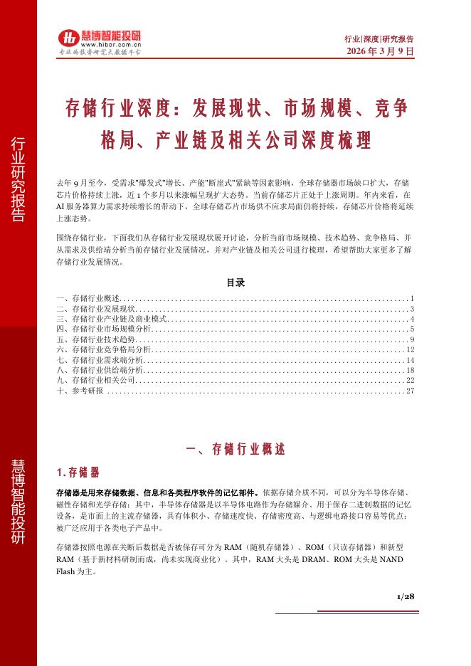 慧博智能投研:存储行业深度:发展现状、市场规模、竞争格局、产业链及相关公司深度梳理.pdf