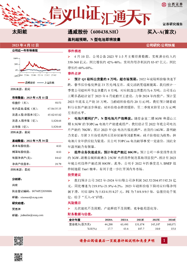 山西证券:通威股份(600438)-盈利超预期,N型电池即将放量.pdf