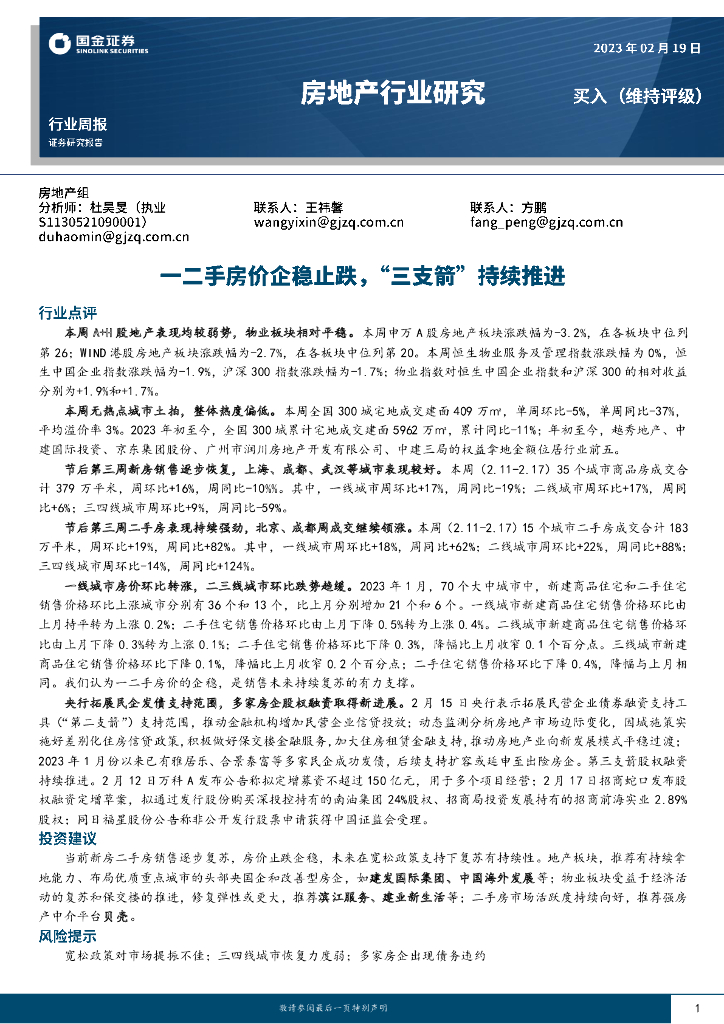 国金证券:房地产行业研究:一二手房价企稳止跌,“三支箭”持续推进.pdf