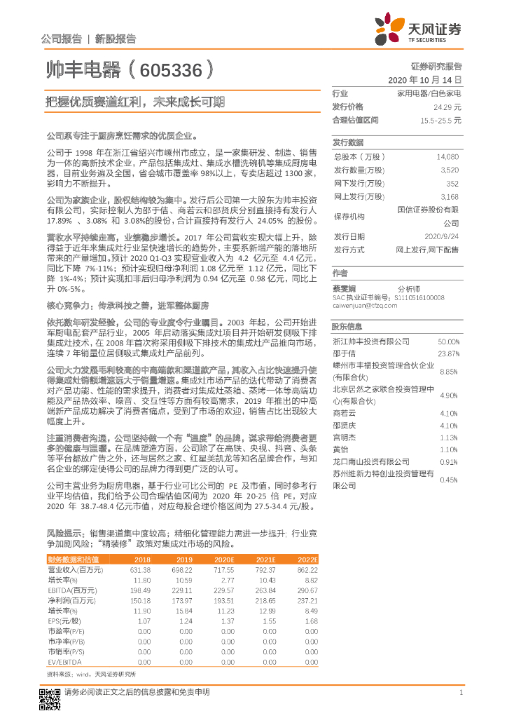 天风证券:帅丰电器(605336)-把握优质赛道红利,未来成长可期.pdf