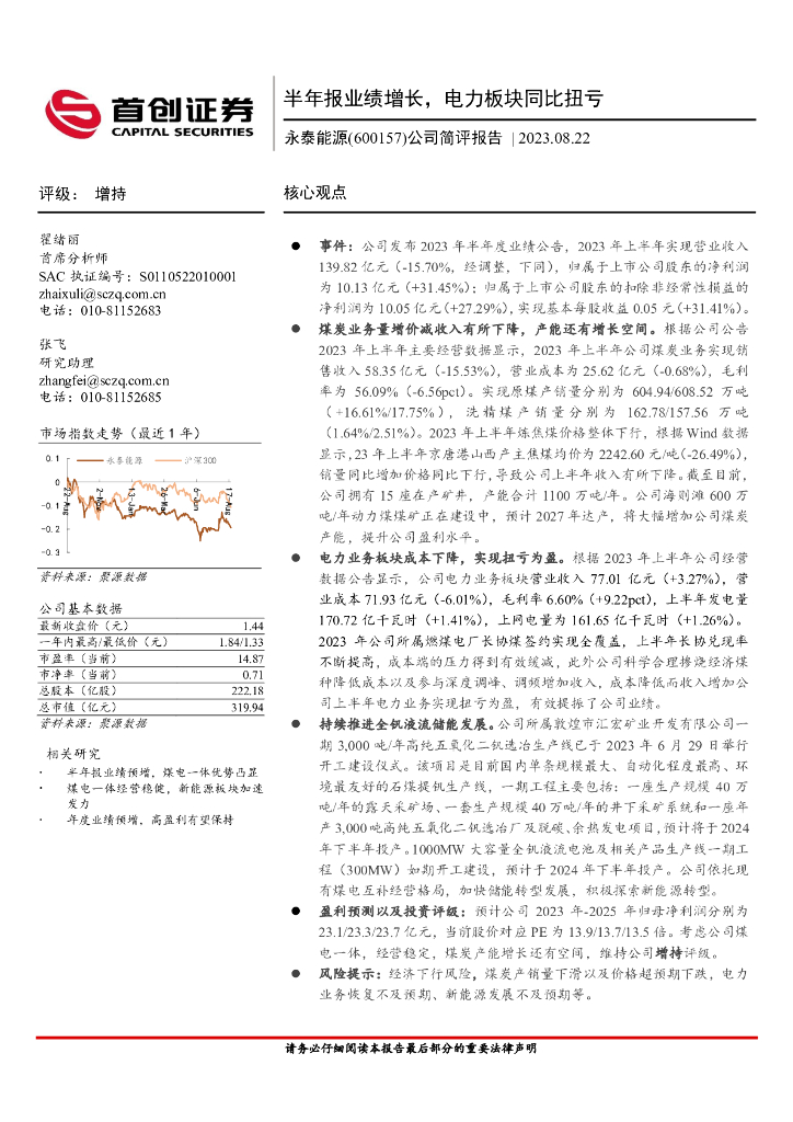 首创证券:永泰能源(600157)-公司简评报告:半年报业绩增长,电力板块同比扭亏.pdf