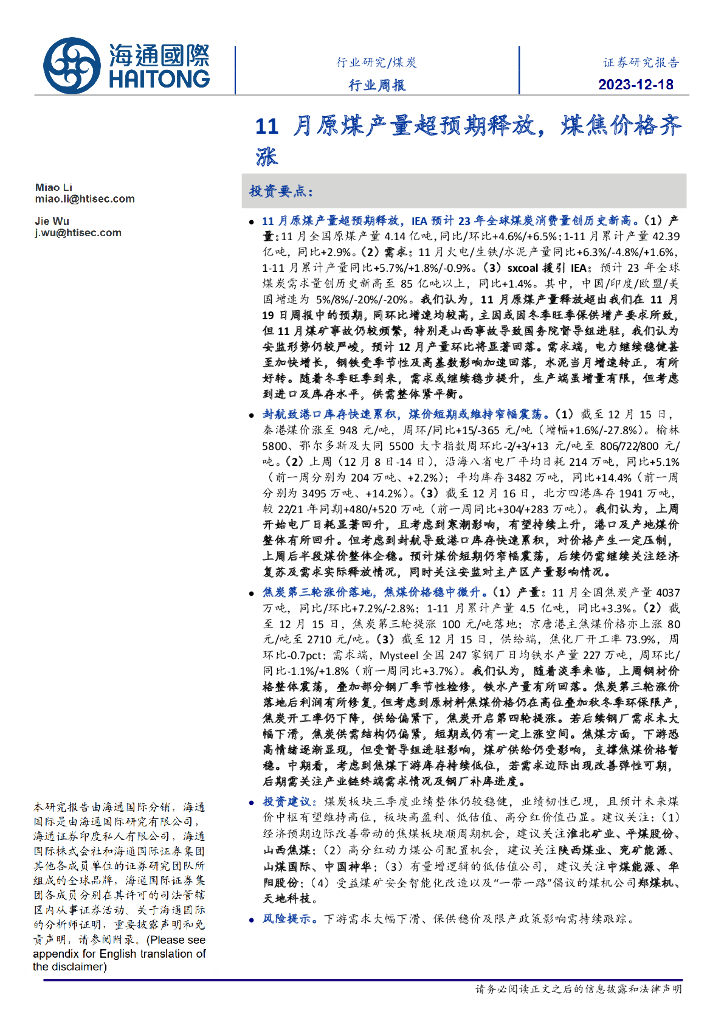 海通国际:煤炭行业周报:11月原煤产量超预期释放,煤焦价格齐涨.pdf