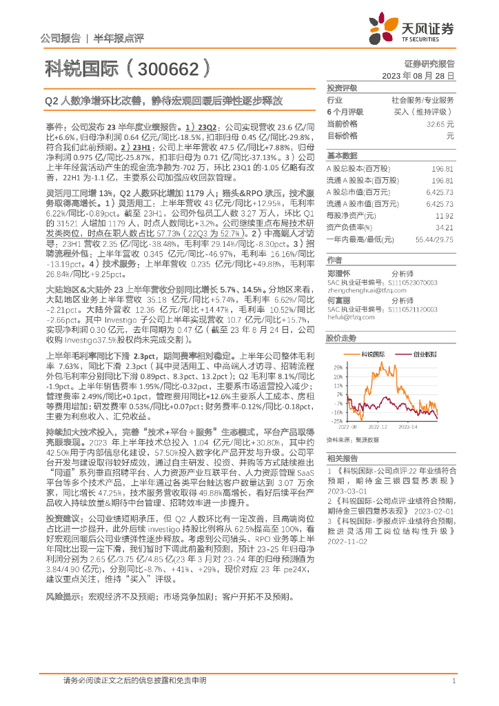 天风证券:科锐国际(300662)-Q2人数净增环比改善,静待宏观回暖后弹性逐步释放.pdf