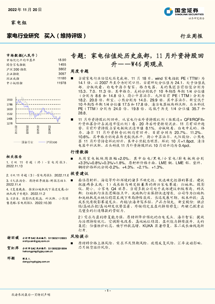 国金证券:家电行业研究W46周观点:专题:家电估值处历史底部,11月外资持股回升.pdf