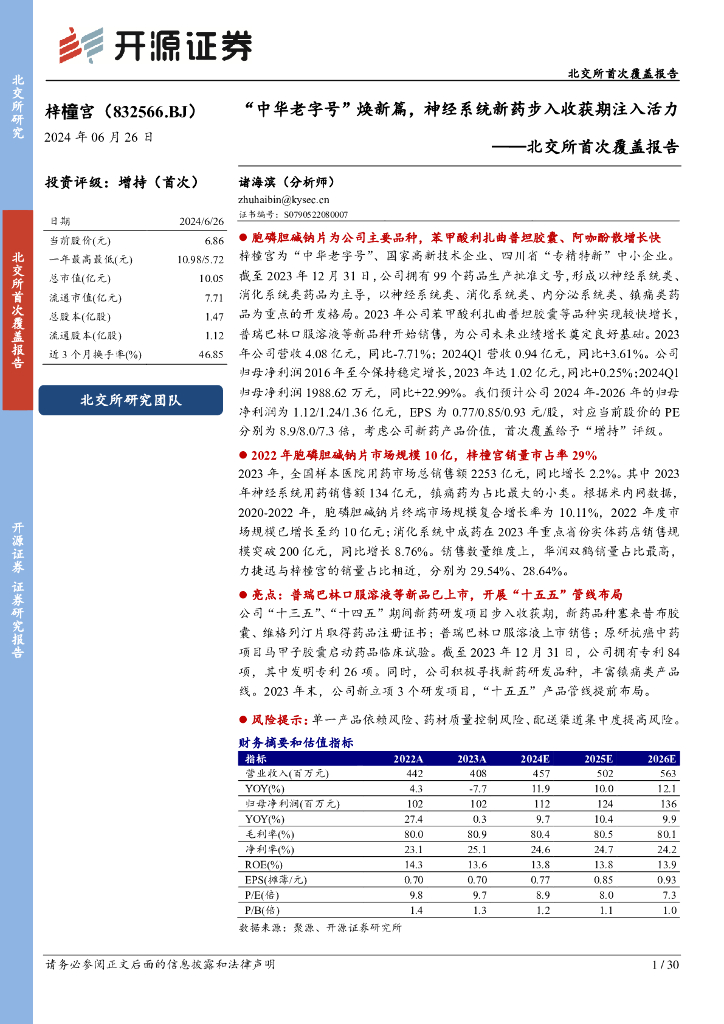 开源证券:梓橦宫(832566)-北交所首次覆盖报告:“中华老字号”焕新篇,神经系统新药步入收获期注入活力.pdf