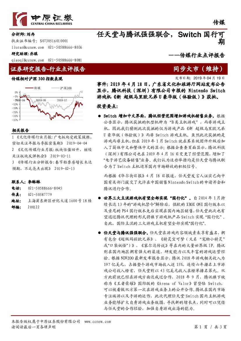 中原证券:传媒行业点评报告:任天堂与腾讯强强联合,Switch国行可期.pdf