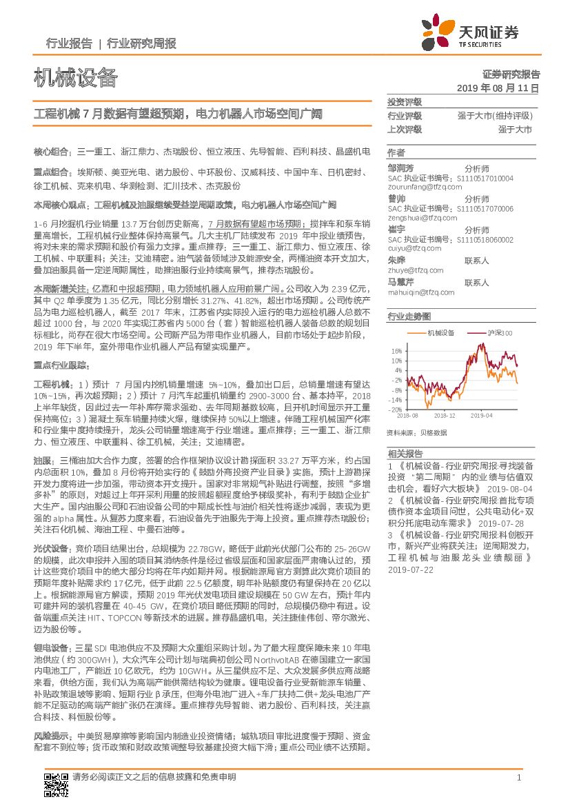 天风证券:机械设备行业研究周报:工程机械7月数据有望超预期,电力机器人市场空间广阔.pdf