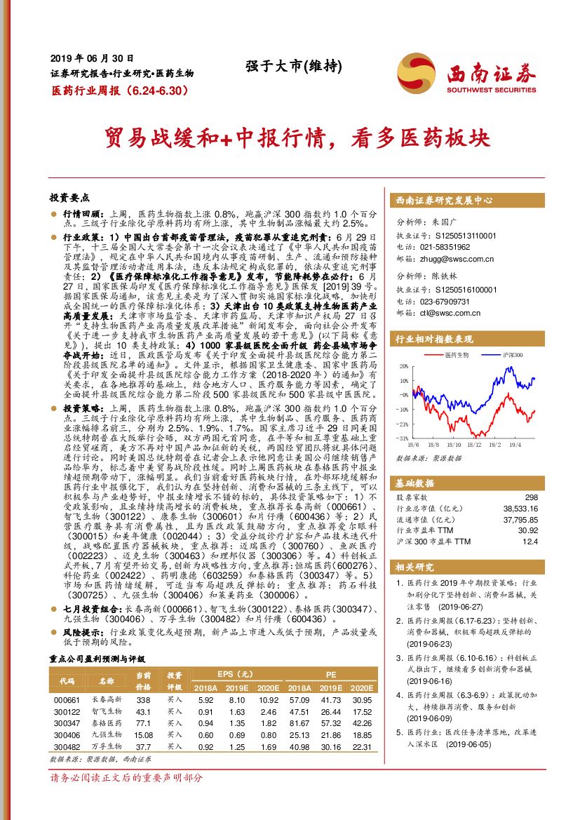 西南证券:医药生物行业周报:贸易战缓和+中报行情,看多医药板块.pdf