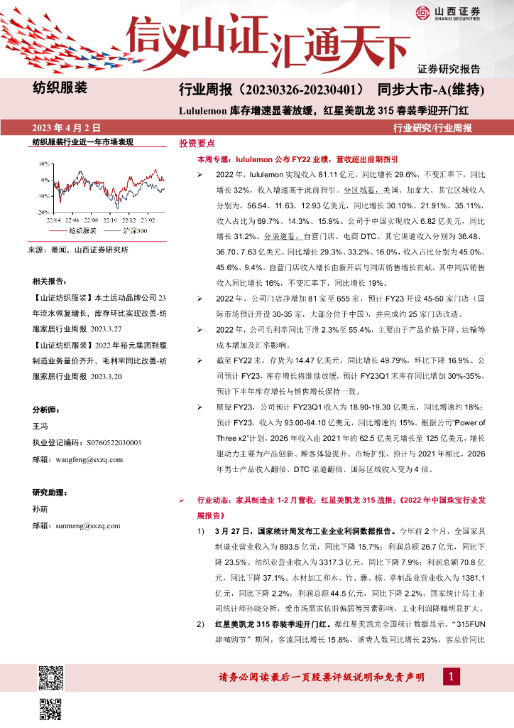 山西证券:纺织服装行业周报:Lululemon库存增速显著放缓,红星美凯龙315春装季迎开门红.pdf