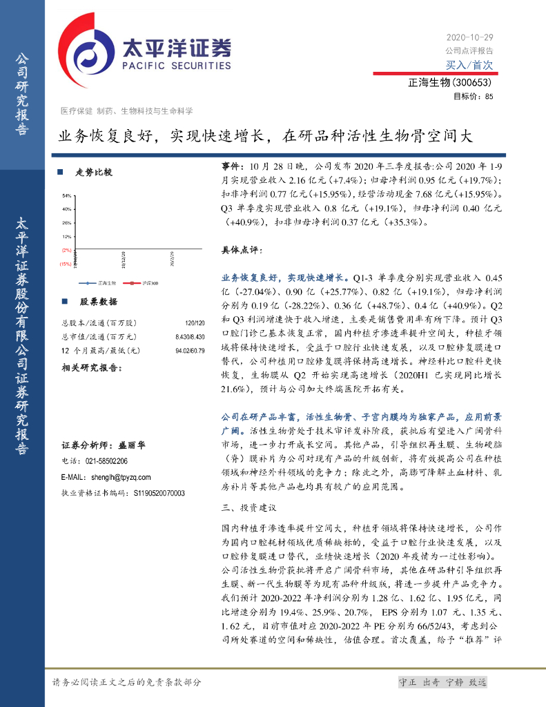 太平洋证券:正海生物(300653)-业务恢复良好,实现快速增长,在研品种活性生物骨空间大.pdf