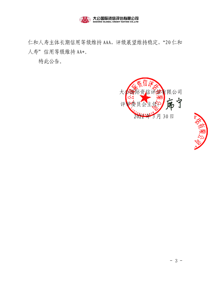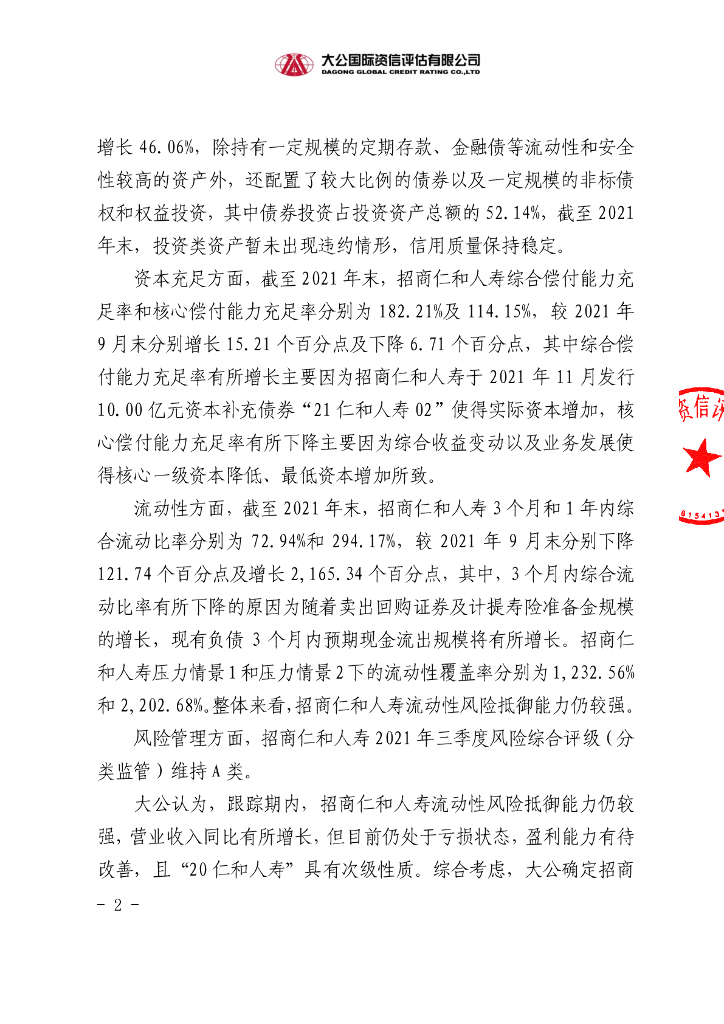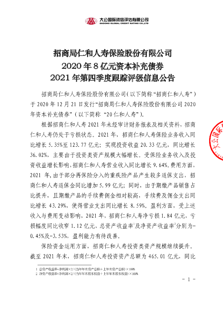 大公:招商局仁和人寿保险股份有限公司2020年8亿元资本补充债券2021年第四季度跟踪评级信息公告.pdf
