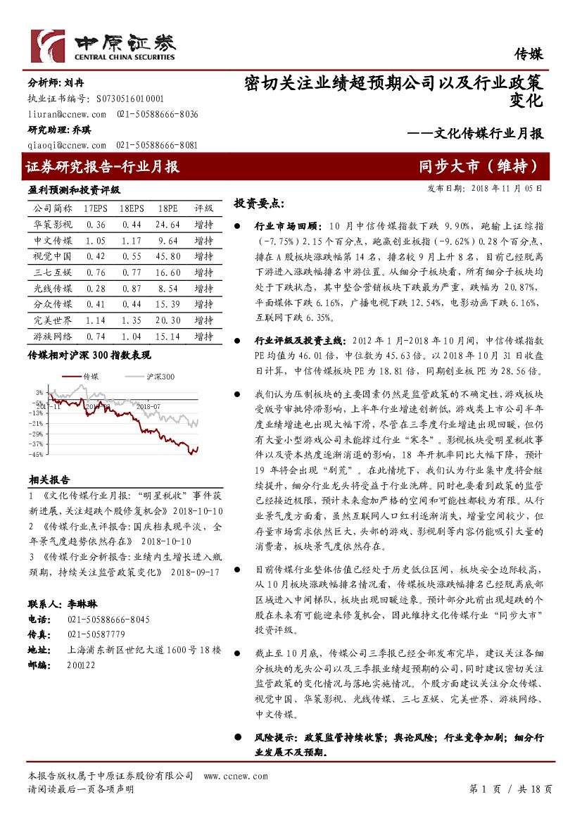 中原证券:文化传媒行业月报:密切关注业绩超预期公司以及行业政策变化.pdf