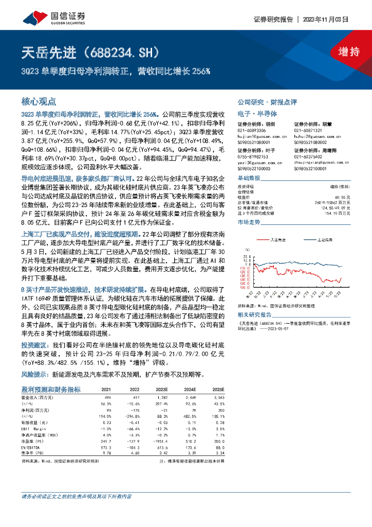 国信证券:天岳先进(688234)-3Q23单季度归母净利润转正,营收同比增长256%.pdf