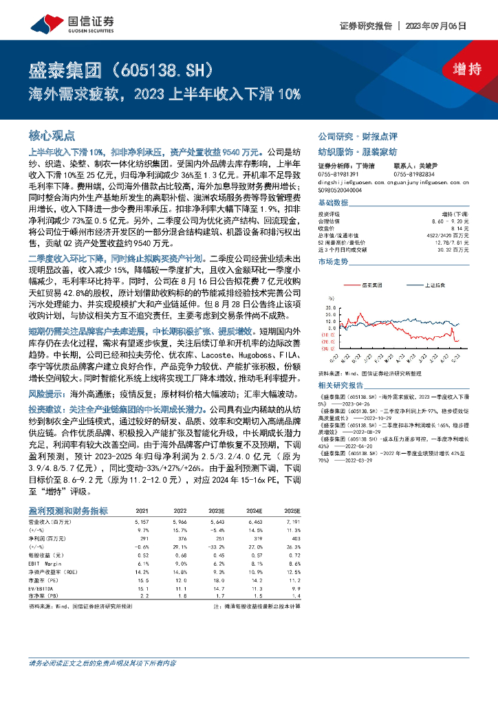 国信证券:盛泰集团(605138)-海外需求疲软,2023上半年收入下滑10%.pdf