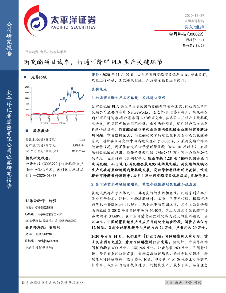 太平洋证券:金丹科技(300829)-丙交酯项目试车,打通可降解PLA生产关键环节.pdf