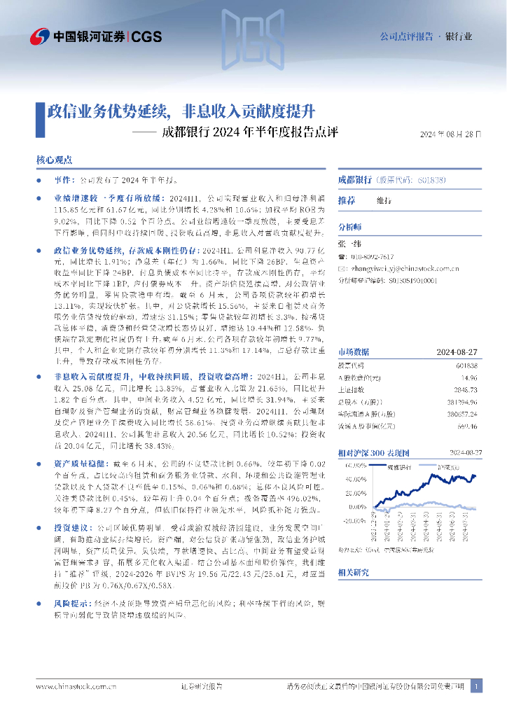 中国银河:成都银行2024年半年度报告点评:政信业务优势延续,非息收入贡献度提升.pdf
