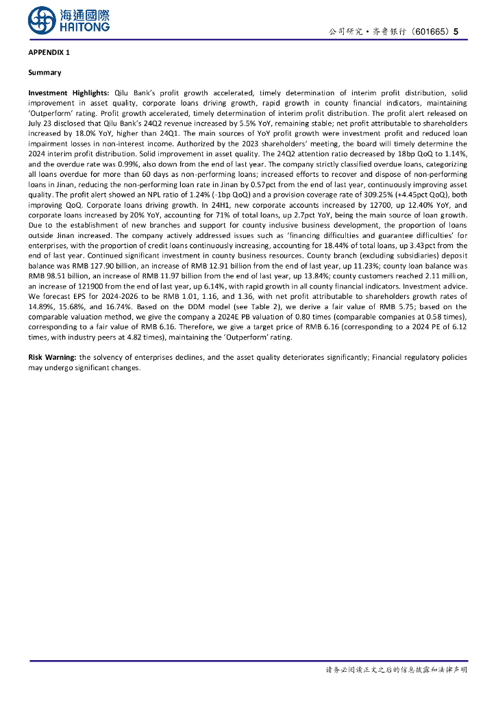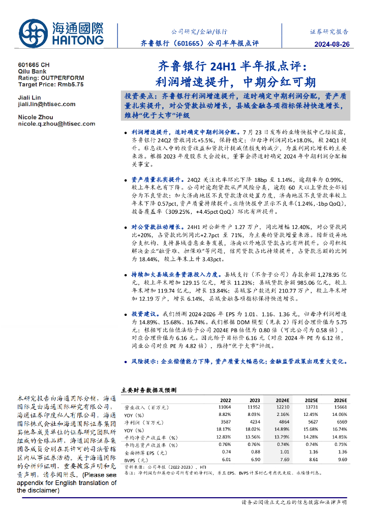 海通国际:齐鲁银行24H1半年报点评:利润增速提升,中期分红可期.pdf