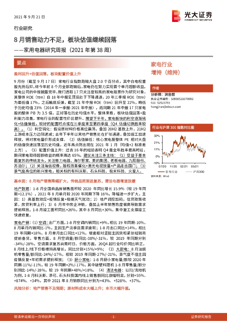 光大证券:家用电器研究周报(2021年第38周):8月销售动力不足,板块估值继续回落.pdf