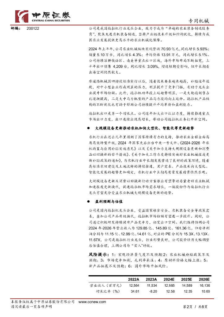 中原证券:一拖股份(601038)-中报点评:中报稳健增长,受益农机设备更新及海外市场开拓.pdf