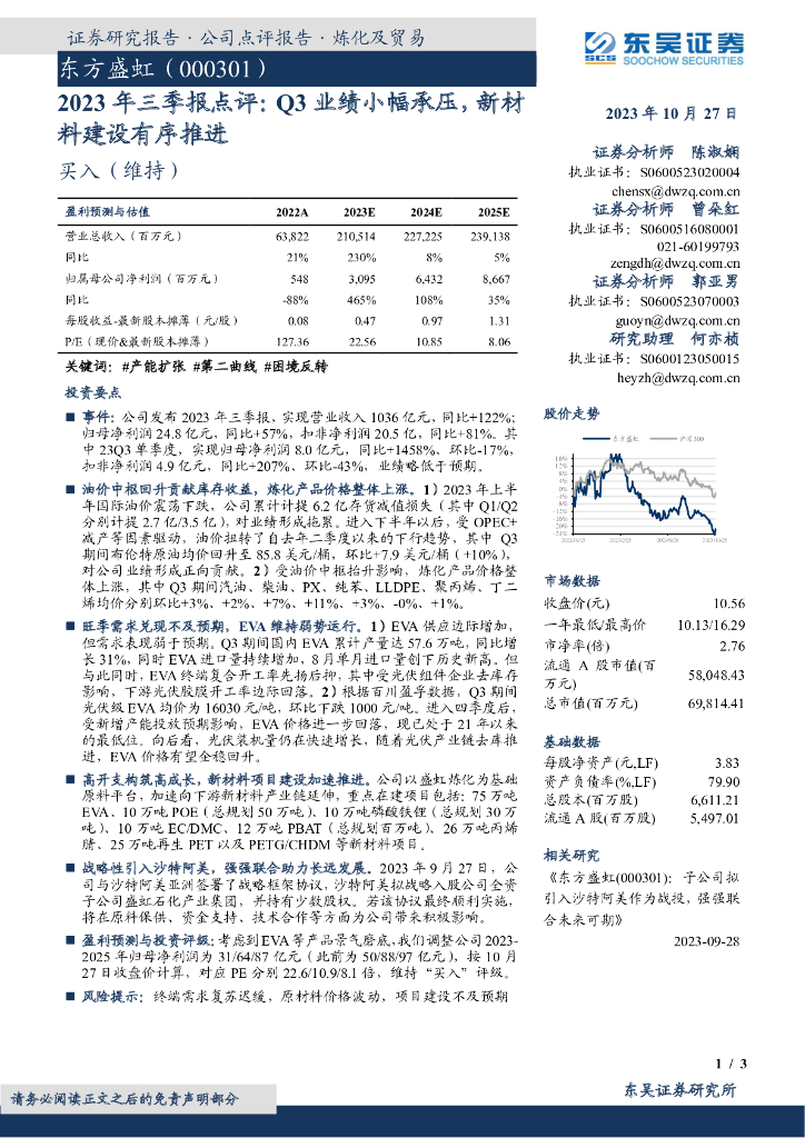 东吴证券:东方盛虹(000301)-2023年三季报点评:Q3业绩小幅承压,新材料建设有序推进.pdf