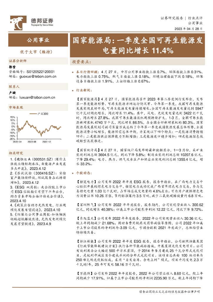 德邦证券:公用事业国家能源局:一季度全国可再生能源发电量同比增长11.4%.pdf