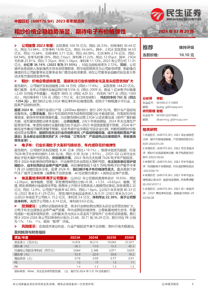 民生证券:中国巨石(600176)-2023年年报点评:粗纱价格企稳趋势渐显,期待电子布价格弹性.pdf
