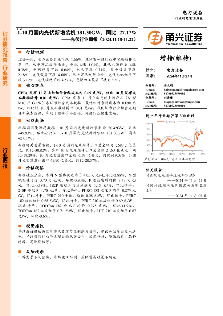 甬兴证券:光伏行业周报:1-10月国内光伏新增装机181.30GW,同比+27.17%.pdf