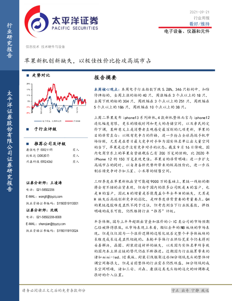 太平洋证券:电子设备、仪器和元件行业周报:苹果新机创新缺失,以极佳性价比抢攻高端市占.pdf