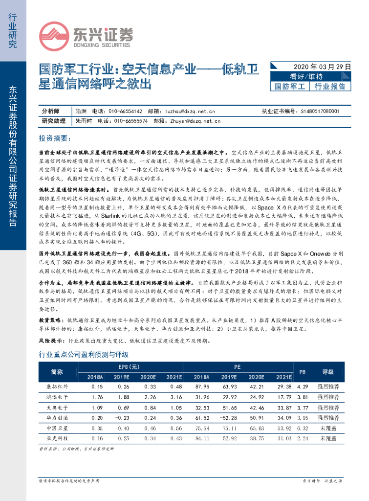 东兴证券:国防军工行业:空天信息产业-低轨卫星通信网络呼之欲出.pdf