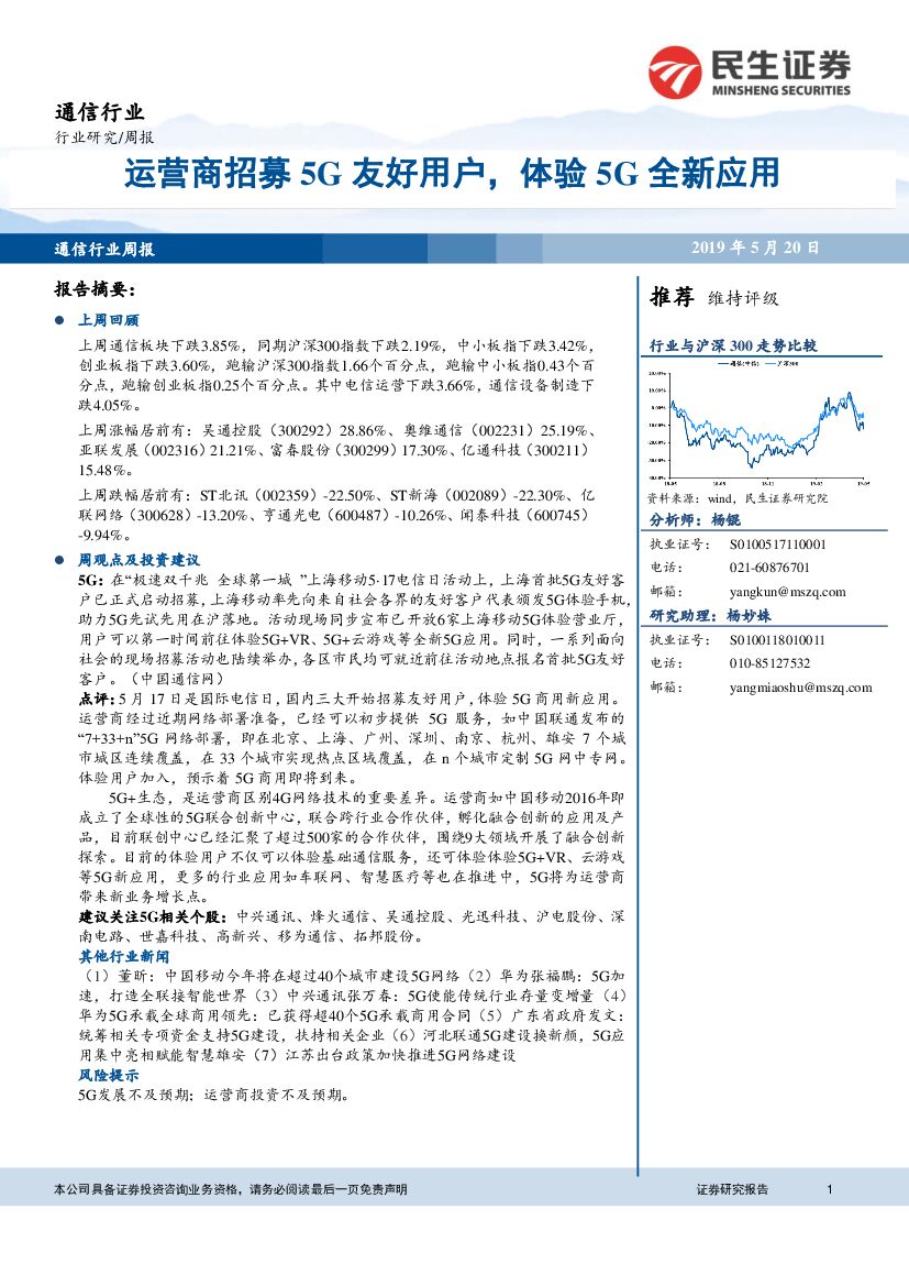 民生证券:通信行业周报:运营商招募5G友好用户,体验5G全新应用.pdf